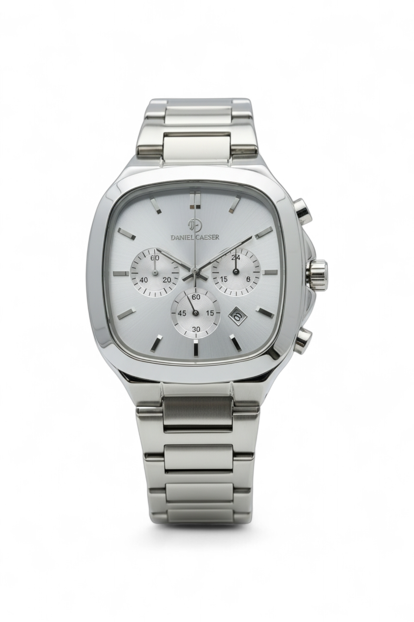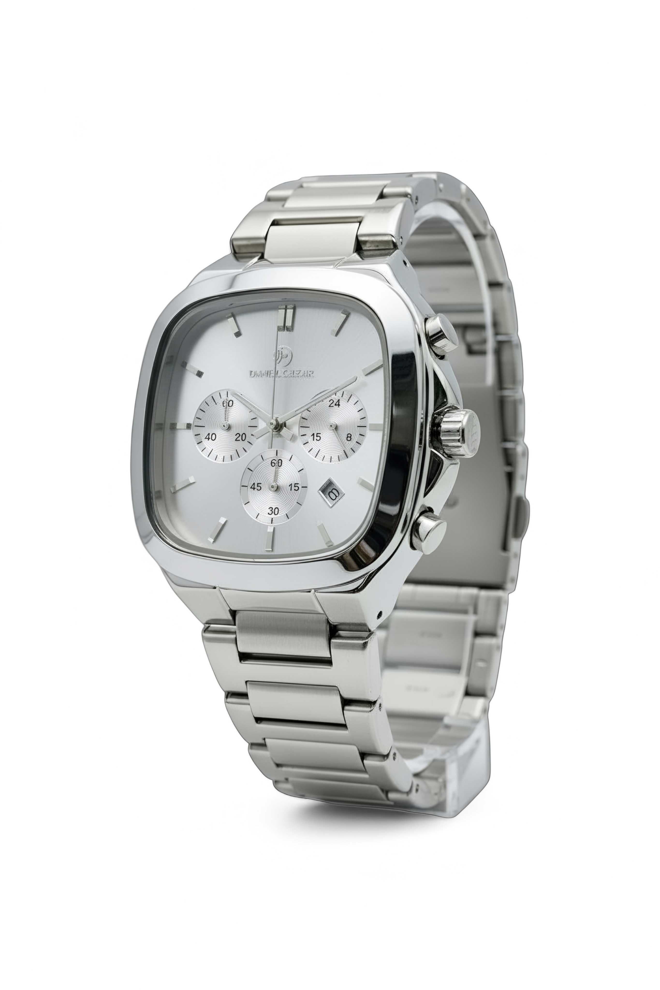 ساعت مچی مردانه چهارگوش کورنوگراف دنیل سزار، از نظر طراحی جزو مدلهای خاص و متفاوت بازار است. فرم چهارگوش قاب در کنار رنگ نقرهای استیل، آن را به گزینهای مناسب برای آقایانی تبدیل کرده که به دنبال ساعتی غیرتکراری هستند.