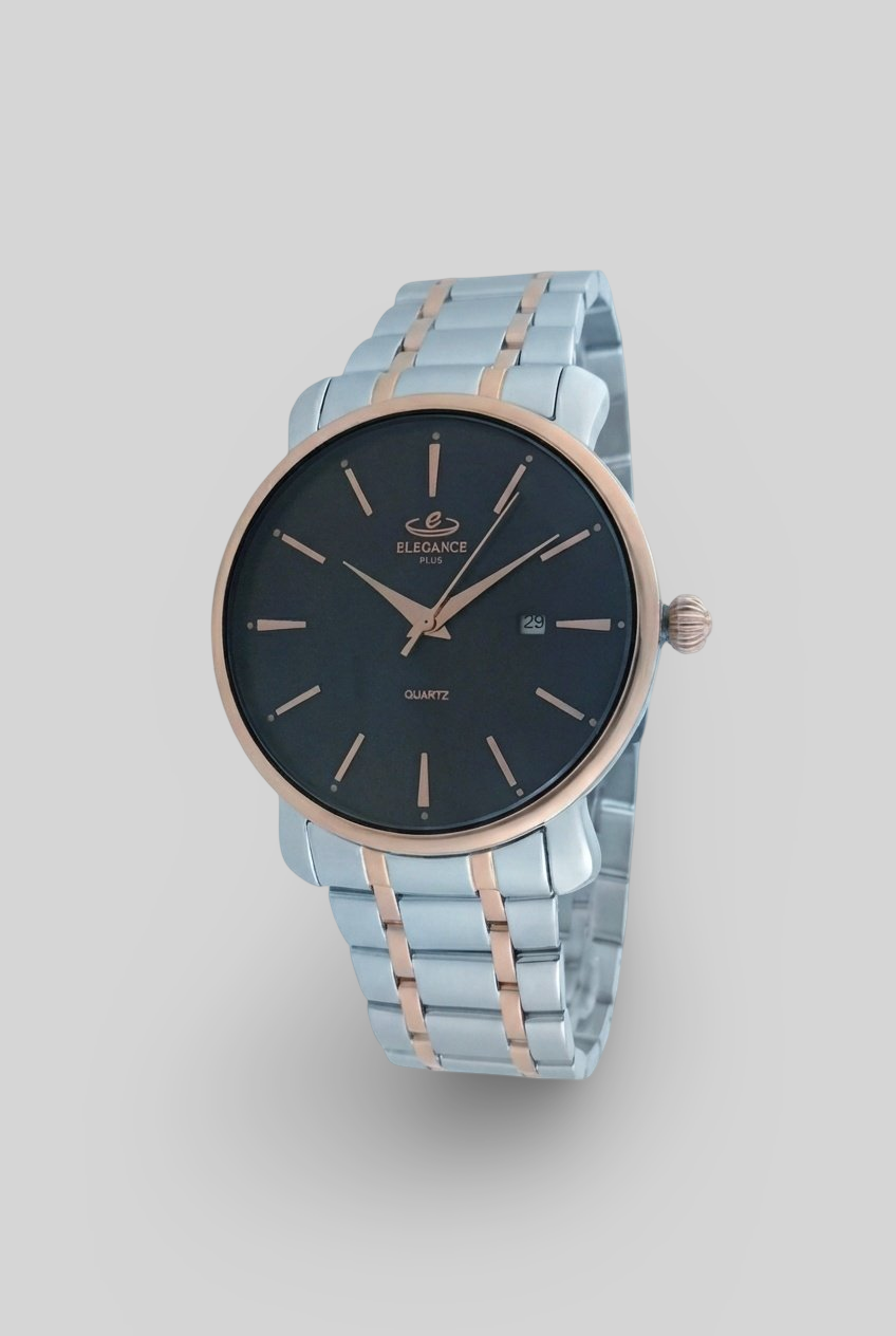 ساعت مردانه الگانس پلاس یک انتخاب شیک، ساده و بسیار لوکس برای آقایانی است که به سبک کلاسیک و مینیمال علاقه دارند. طراحی این مدل با ترکیب زیبای استیل نقرهای و رزگلد، جلوهای دورنگ و جذاب ایجاد کرده که روی دست بسیار چشمگیر و خاص دیده میشود.