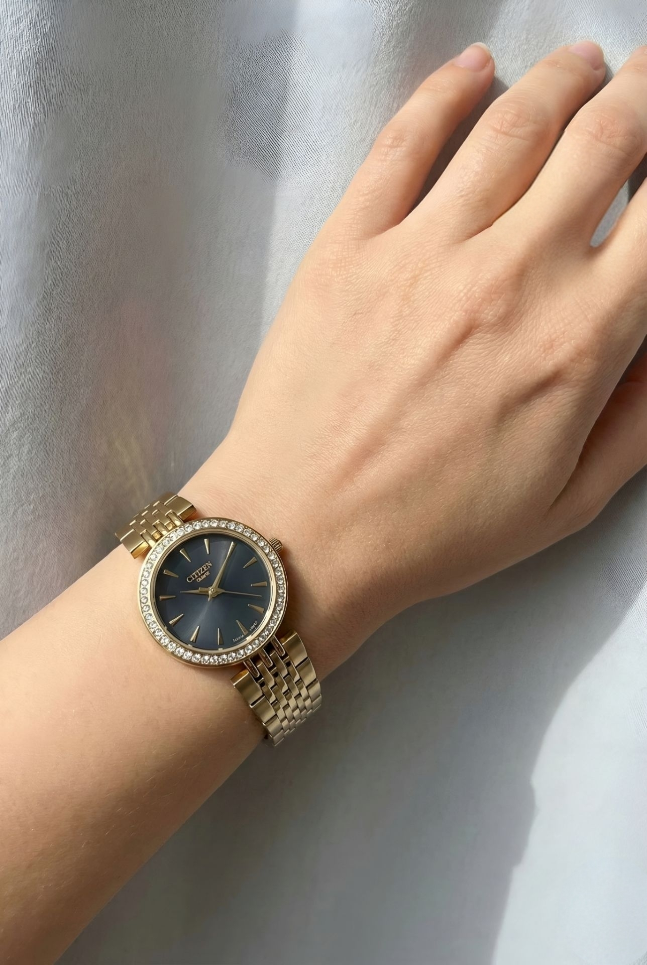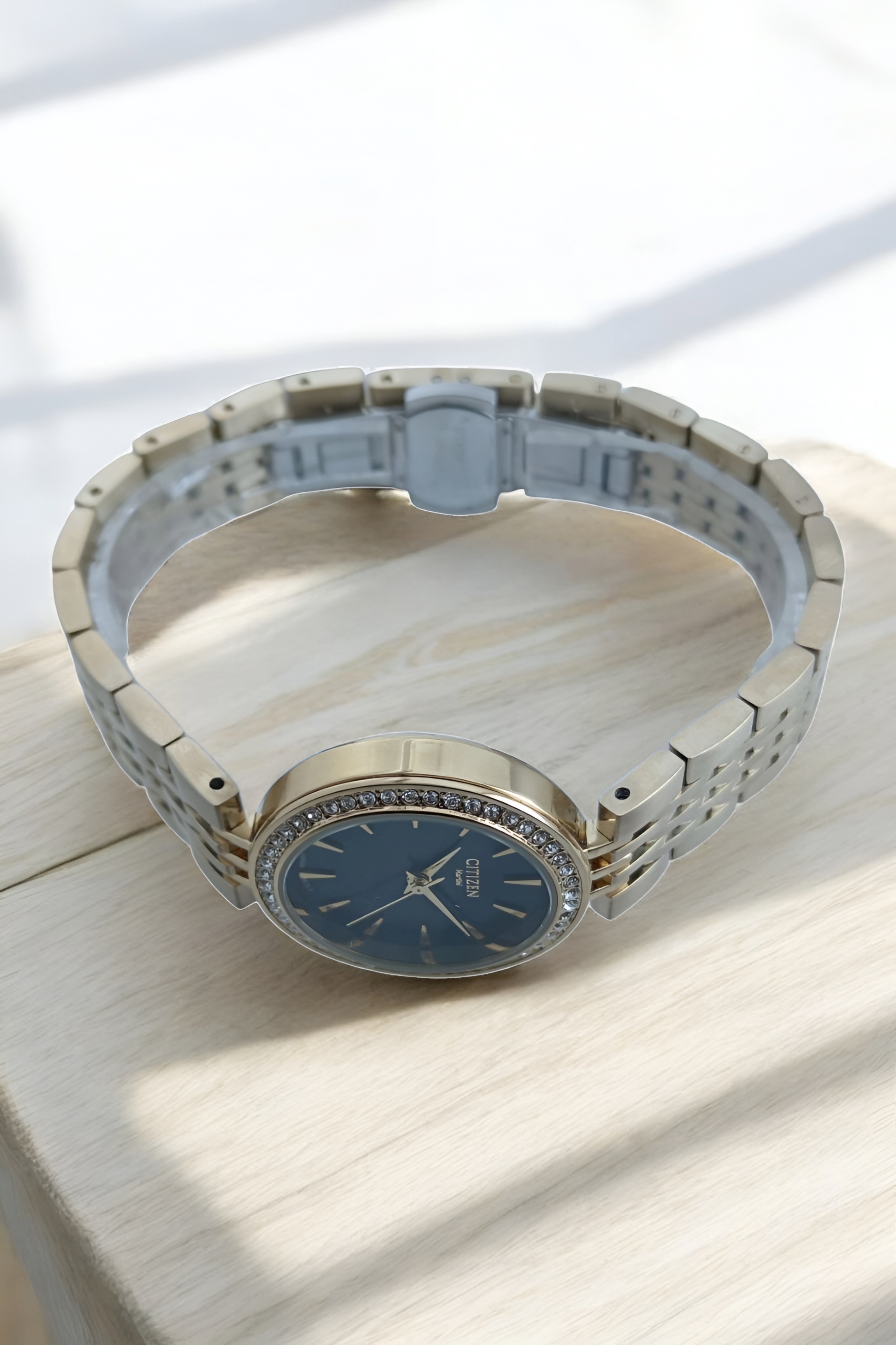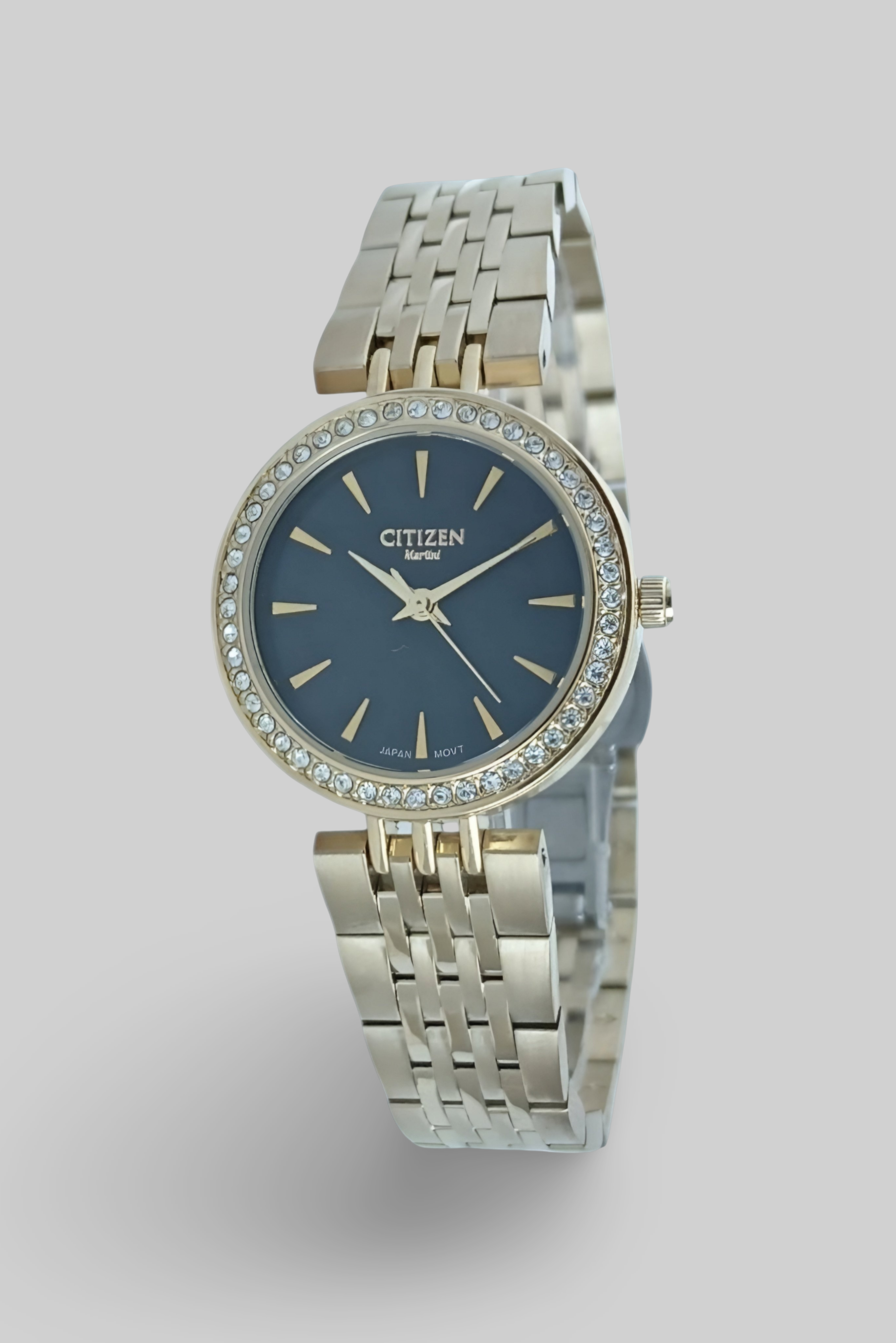 این مدل از سیتیزن مارتینی یکی از محبوبترین انتخابها در میان ساعتهای زنانه سبک کلاسیک و مجلسی است. ترکیب رنگ طلایی با صفحه تیره، کنتراست زیبایی ایجاد میکند و نگینهای دور قاب، ساعت را برای استایلهای رسمی و مهمانیها بسیار مناسب کرده است.