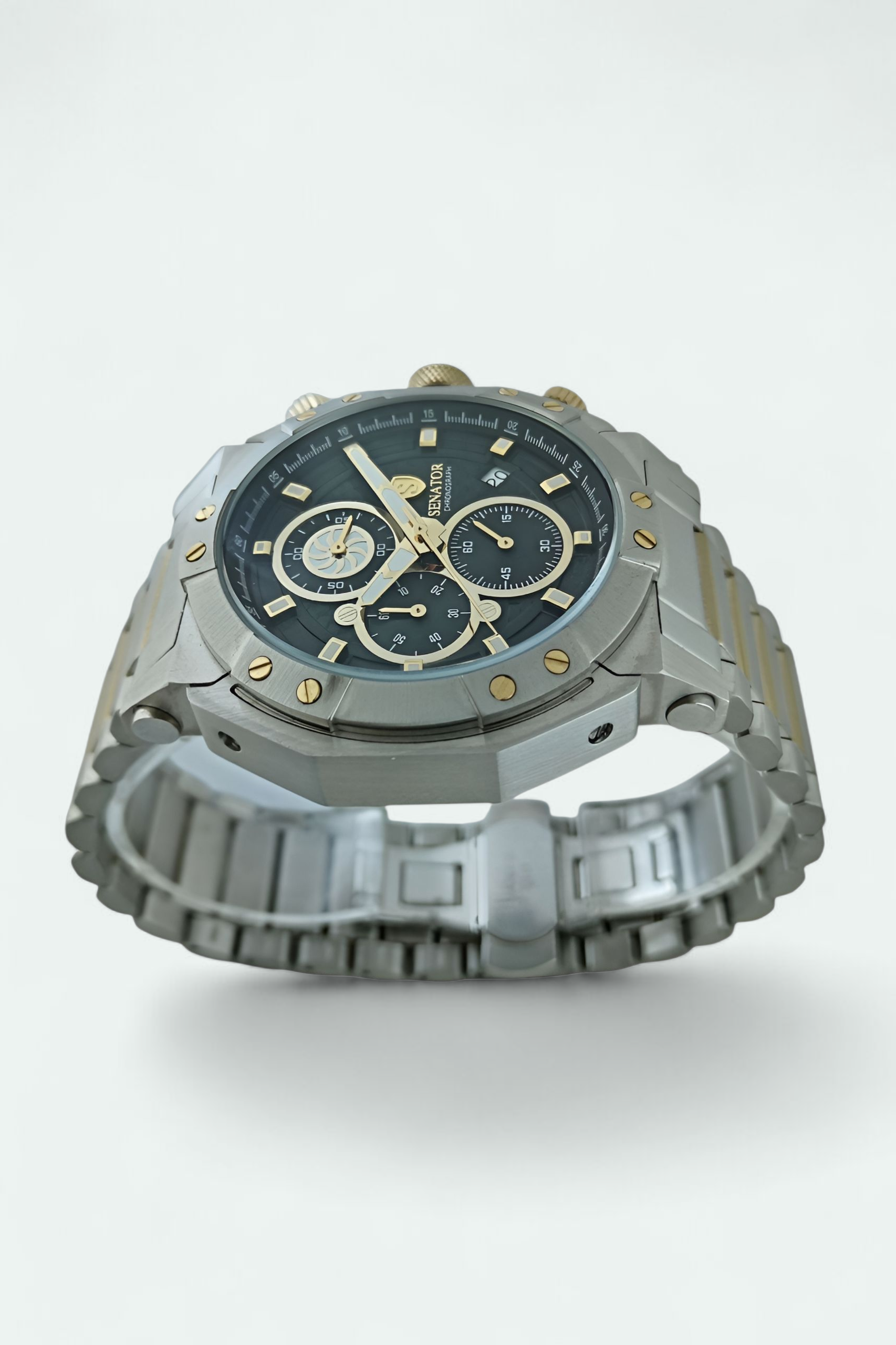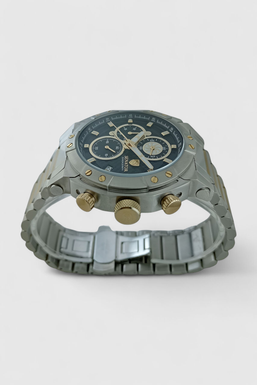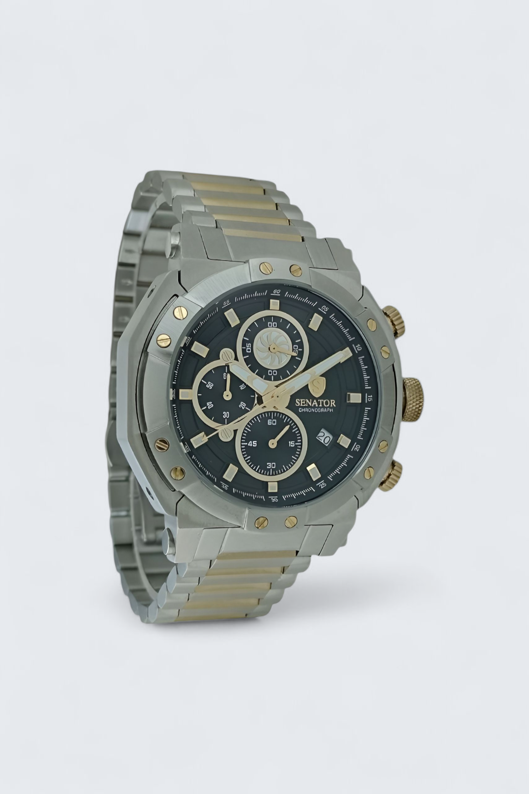 ساعت مچی مردانه سناتور مدل ST1065G یک انتخاب شیک و مدرن برای آقایانیست که به استایل خود اهمیت میدهند. این مدل کورنوگراف با طراحی خاص ، بههمراه نمایش تاریخ، جلوهای کاملاً حرفهای به دست شما میدهد. بدنه و بند این ساعت از استیل باکیفیت ساخته شده و بند فلزی دورنگ آن با ترکیب طلایی بسیار لایت، زیبایی خاصی به آن بخشیده است.