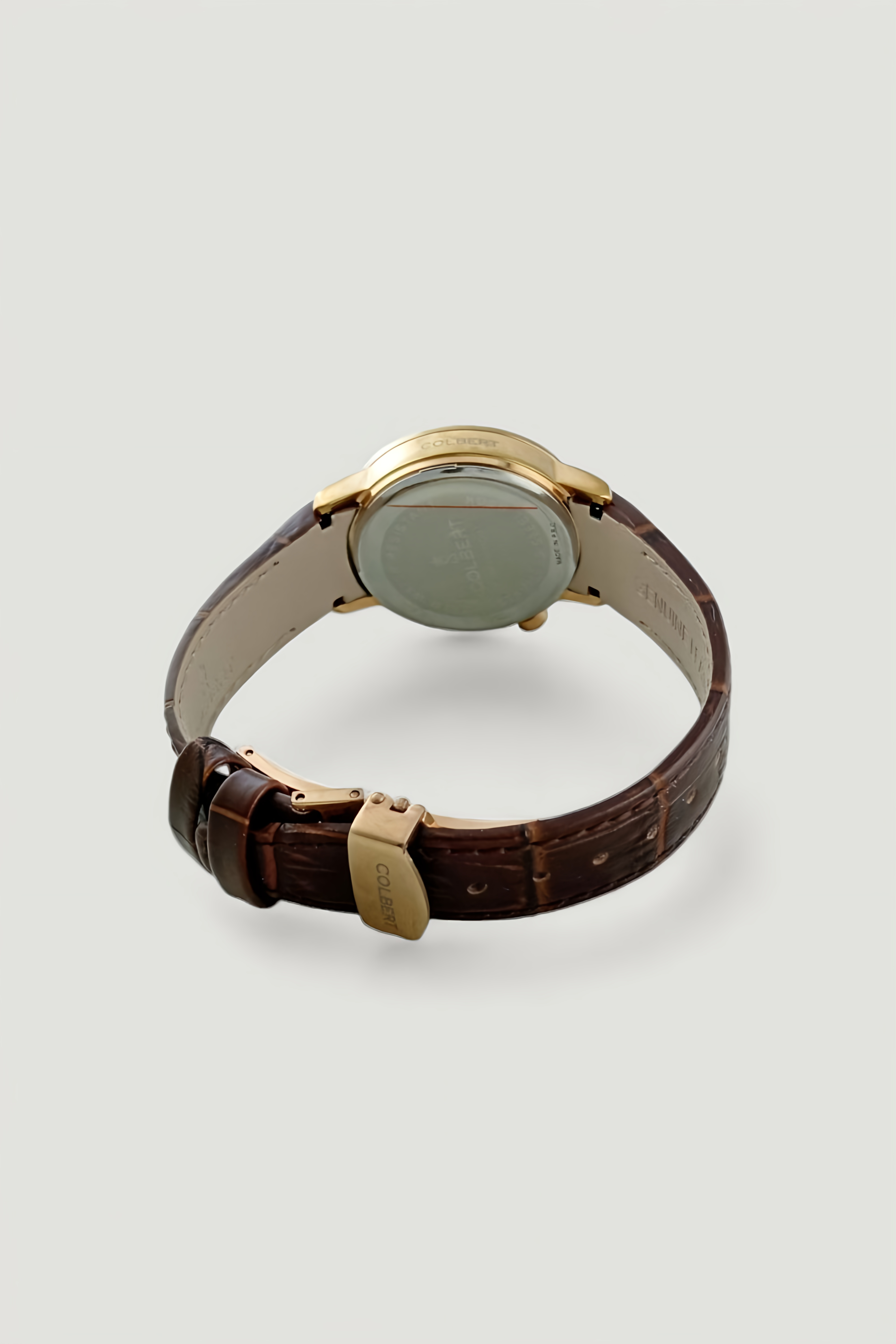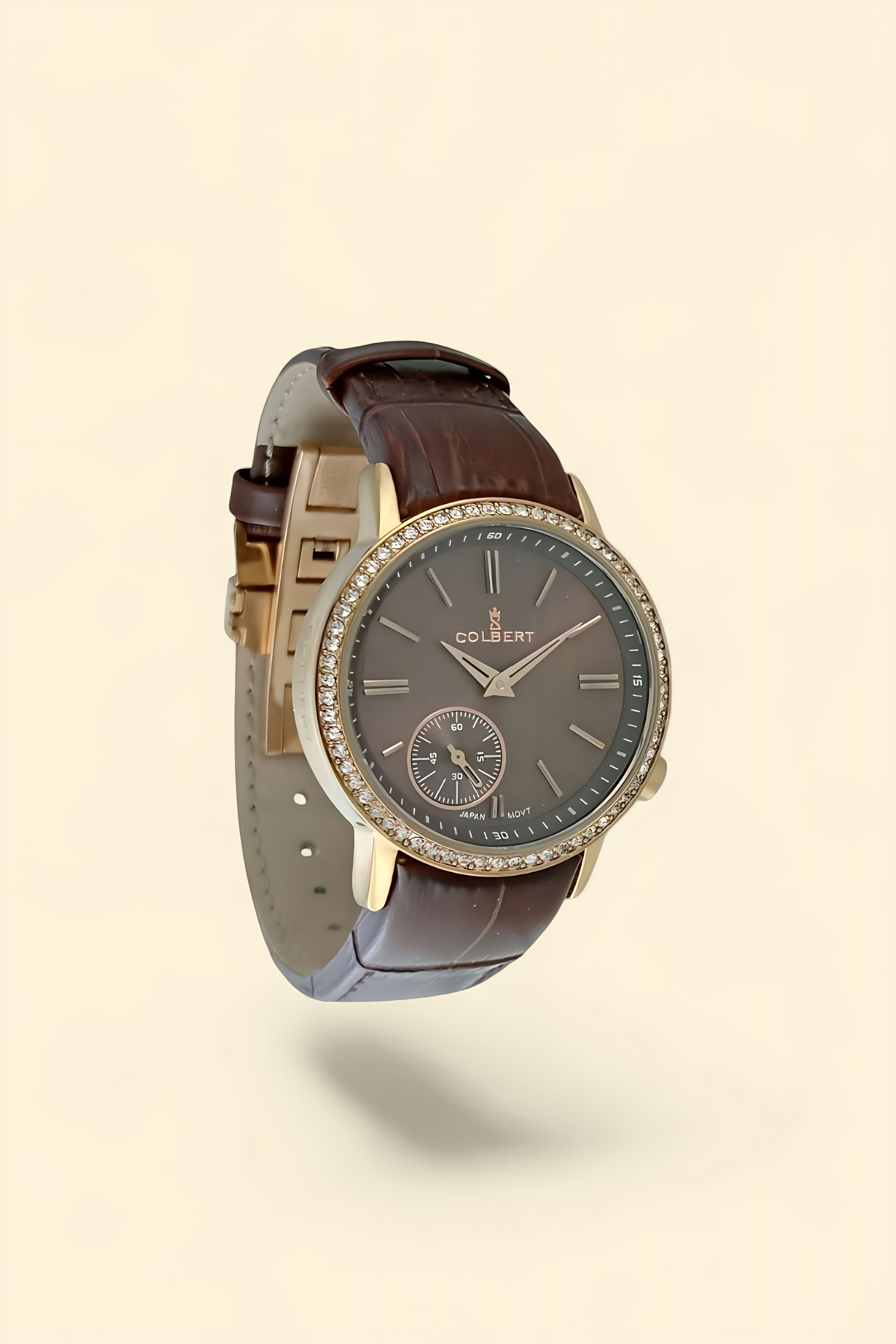 ساعت مچی زنانه برند Colbert با طراحی لوکس و اسپرت، انتخابی عالی برای خانمهایی که به جزئیات و کیفیت اهمیت میدهند. این مدل با بند چرمی قهوهای نرم و راحت، قاب رزگلد براق با نگینهای درخشان، و صفحه کافی (قهوهای سوخته) طراحی شده که جلوهای بسیار شیک به دست شما میبخشد.