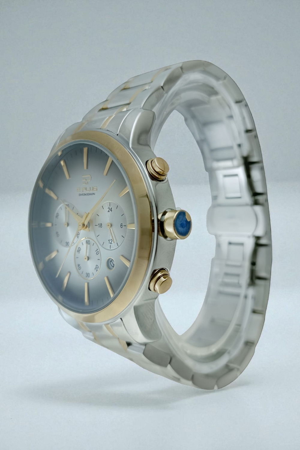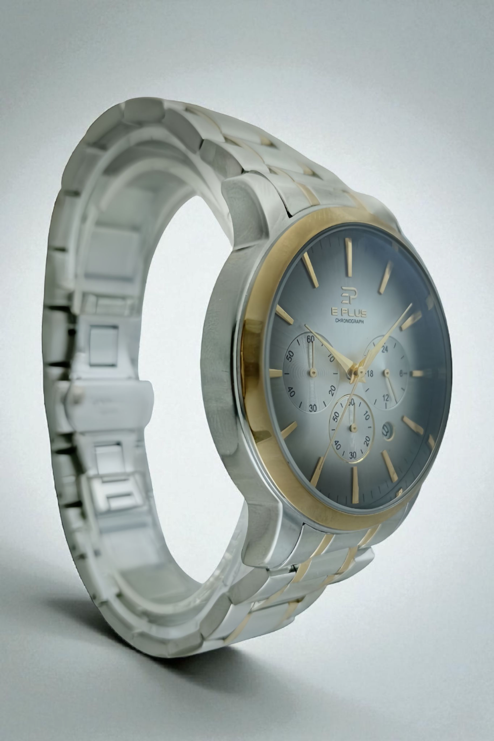 ساعت ای پلاس با قاب آلیاژی عرضه میشود که دوام آن نسبت به قاب استیل کمتر است، اما همین موضوع باعث شده قیمت تمامشده آن اقتصادیتر و بهصرفهتر باشد. بند این مدل از جنس استیل با آبکاری قوی ساخته شده که ماندگاری رنگ بالایی دارد و ظاهر ساعت را مدتها نو و شیک نگه میدارد. طراحی دو رنگ بند در ترکیب با رنگ صفحه خاص ، ساعت را برای استفاده روزمره و حتی استایل رسمی ایدهآل کرده است.