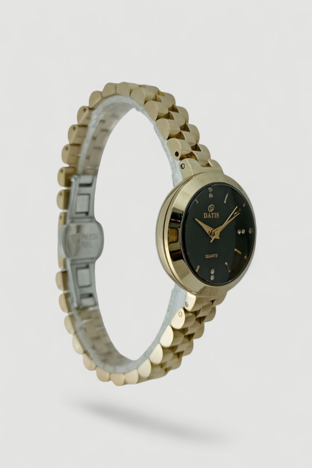 ساعت داتیس دارای بند رولکسی طلایی با ظرافت خاصی است که مناسب استفاده روزمره و مجالس رسمی است. صفحه مشکی آن به همراه نشانگرهای نگیندار، جلوهای مدرن و جسورانه به این ساعت میدهد.