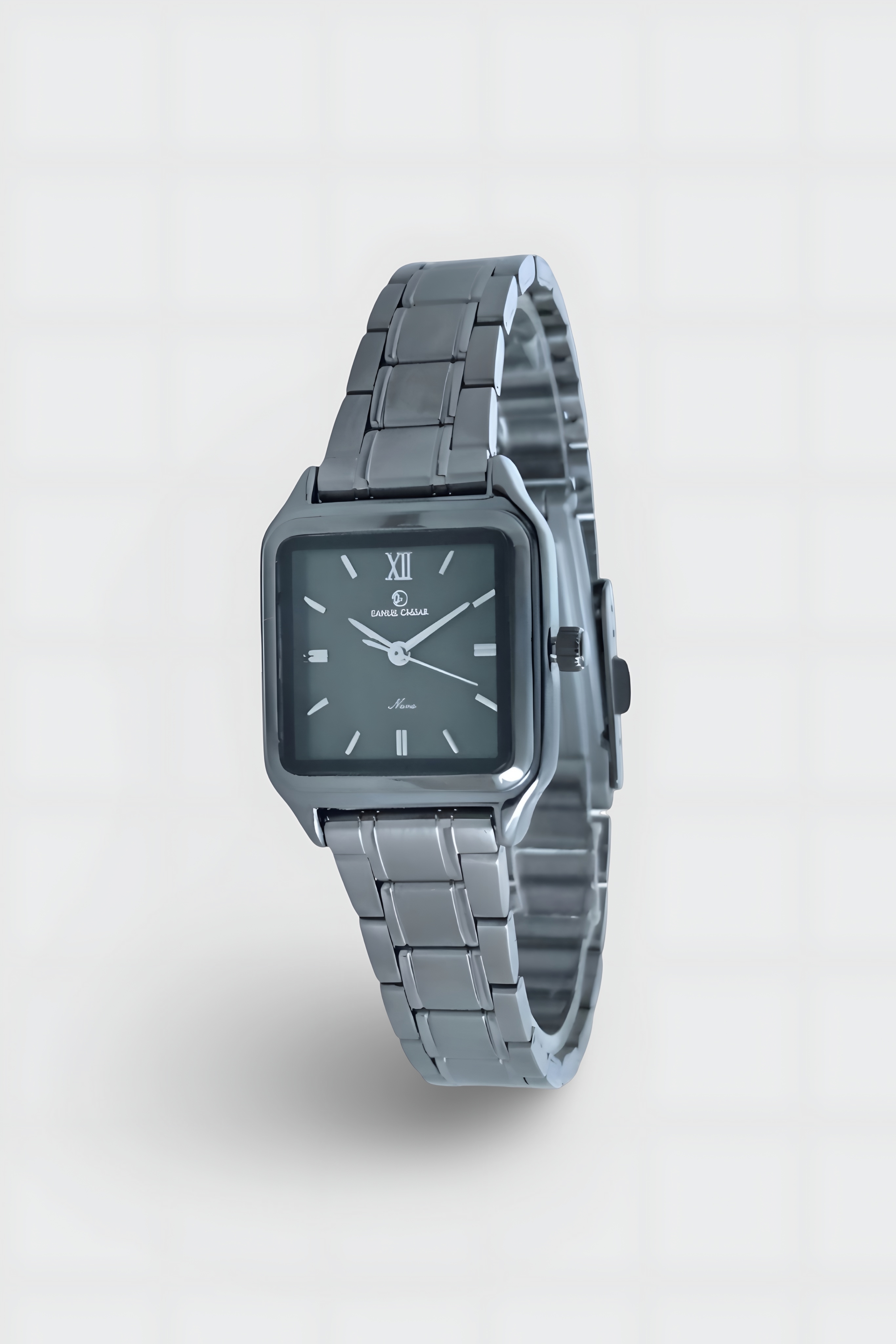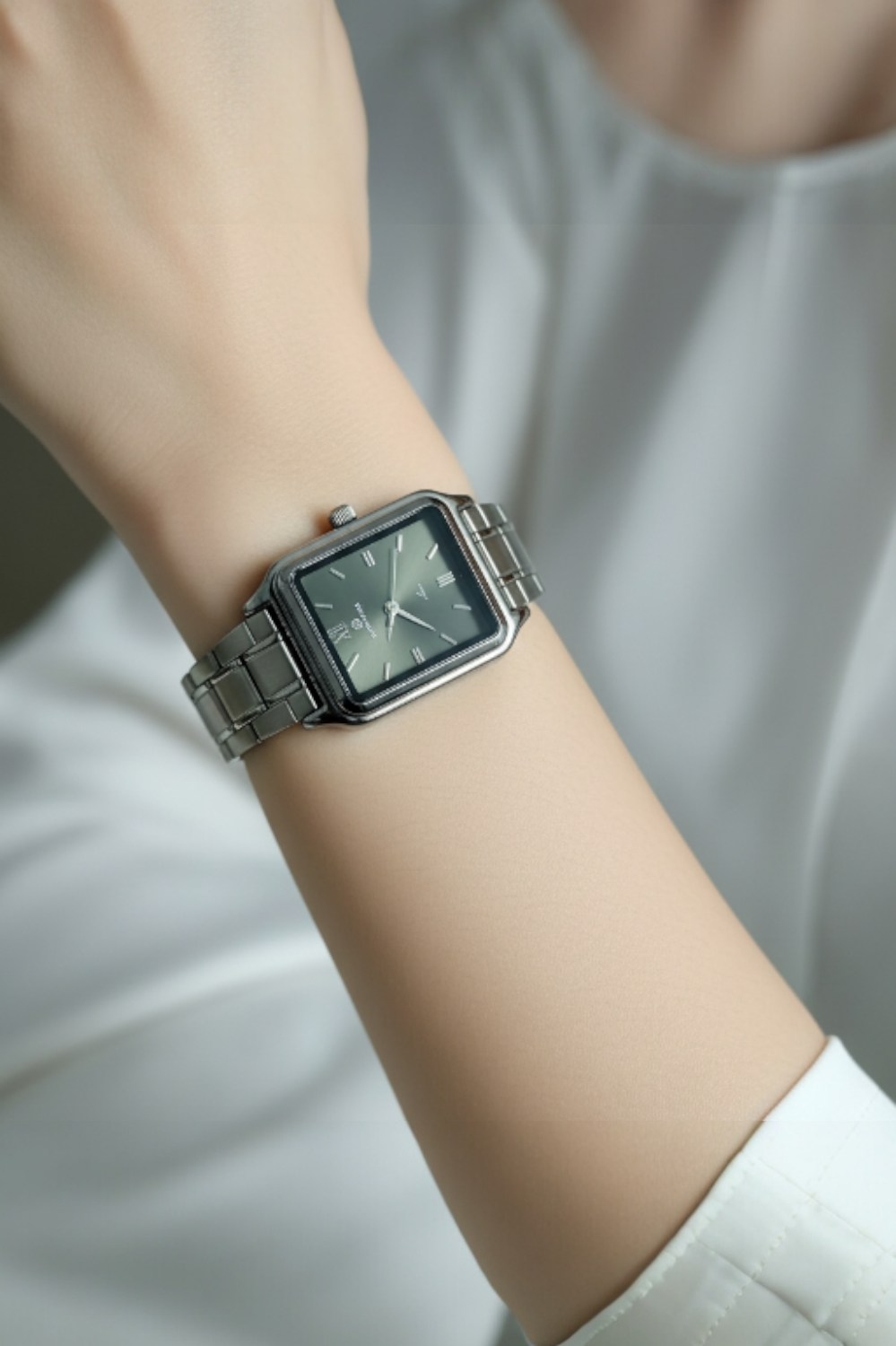 این مدل یکی از ساعتهایی است که هم طراحی اصیل دارد، هم رنگبندی مدرن. قاب چهارگوش سبک کلاسیک را یادآوری میکند و همین باعث شده ساعت روی مچ کاملاً متفاوت دیده شود.